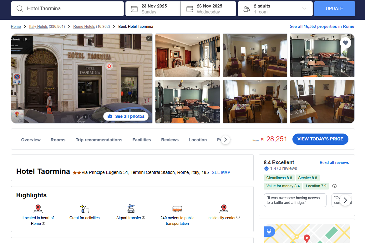 🏨 Szállás: Hotel Taormina – hangulatos, központi elhelyezkedésű szálloda Róma szívében, a Termini pályaudvar közelében. Könnyen megközelíthető minden nevezetesség!